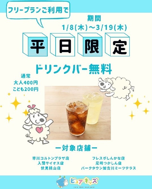 ピュアキッズからお得なキャンペーンのお知らせです。 【平日限定】 ピュアキッズフリーをご利用頂くと、ドリンクバーが無料に!! 通常:大人400円/人、子供200円/人のドリンクバーが無料になるので大変お得です! 開催期間:2026.1.8~3.19 ※平日のみのキャンペーンです ※ドリンクバーご利用時間は10:00〜18:30です 皆様のご来店、心よりお待ちしております!!