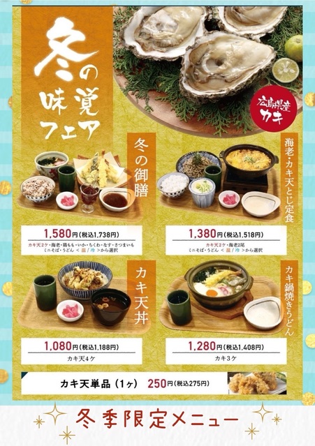 冬限定のメニュー始まりました✨ カキ天ぷら🦪やカキ鍋焼きうどん🍲など、寒いこの時期にぴったりのメニューとなっております。 旬の食材をぜひご賞味下さい✨
