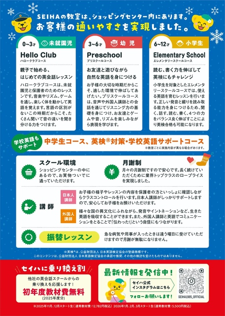 お試しレッスン「サンタスクール」予約受付中です!! 実施期間:11月1日(土)~12月26日 料金:2回2,000円(税込) 入会特典①:サンタスクール受講後1週間以内のご入会で2025年度の教材費無料(3月まで使う教材) 入会特典②:オリジナル2026年度カレンダープレゼント