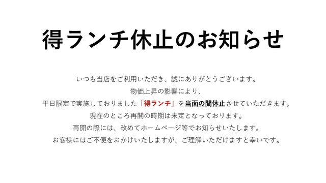 いつも当店をご利用いただき、誠にありがとうございます。 物価上昇の影響により、平日限定で実施しておりました「得ランチ」を、当面の間休止させていただくこととなりました。大変申し訳ございません。 現時点では再開のめどは立っておりません。 何卒ご理解賜りますよう、お願い申し上げます。
